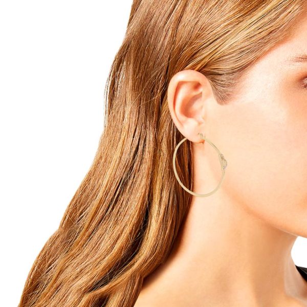Large-sized sleek hoop earrings with sculptural heart motif at front adorned with glistening crystal pave. These modern earrings are set in polished gold-tone metal and have a click-top closure.