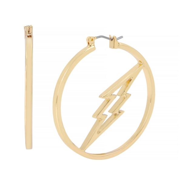 Medium-sized hoop earrings adorned with lightning bolt motif. These striking earrings are set in polished gold-tone metal and have a click-top closure.
