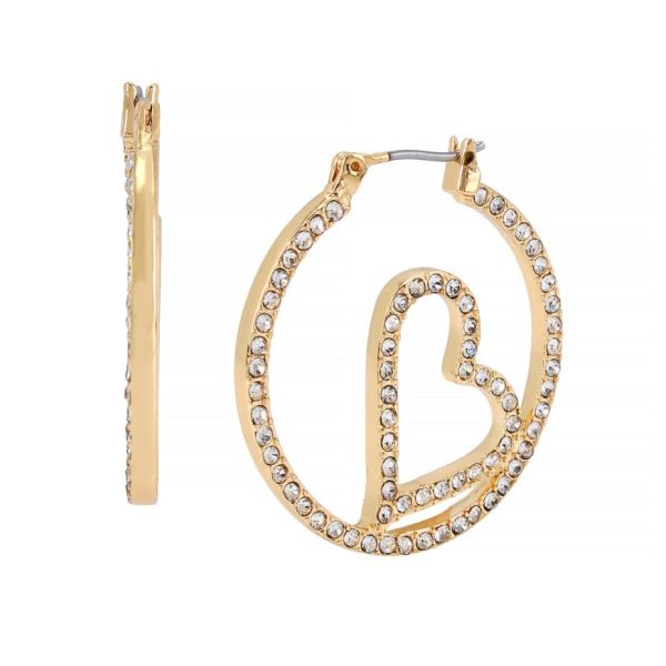 Small-sized sculptural heart motif hoop earrings adorned with glistening crystal pave. These striking earrings are set in polished gold-tone metal and have a click-top closure.