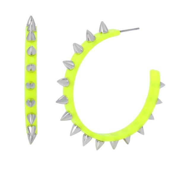 Vibrant green resin open hoop earrings adorned with spikey metal hardware. These bright earrings are set in polished gold-tone metal and have a post back closure.